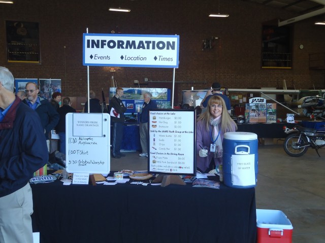 Kathy in the cold hangar, bundled up at the Information Table. You can see the Land Transportation